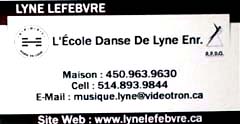 L'École Danse De Lyne Enr. Lyne Lefebvre Tel: (450)963-9630, (514)893-9844 musique.lyne@videotron.ca http://wwww.lynelefebvre.ca